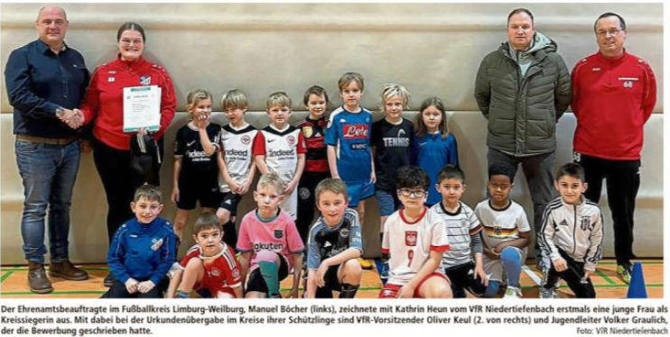 Kathrin Heun vom VfR Niedertiefenbach wurde als erste junge Frau im Fußballkreis Limburg-Weilburg mit dem DFB-Ehrenamtsförderpreis „Fußballheld“ ausgezeichnet. Der Preis würdigt junge, engagierte Trainerinnen und Trainer zwischen 16 und 30 Jahren, die sich in besonderem Maße für den Jugendfußball einsetzen.